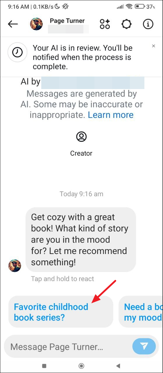 - Your custom AI is now ready. You can start interacting with it by tapping on the suggested prompts or typing your own in the text box.