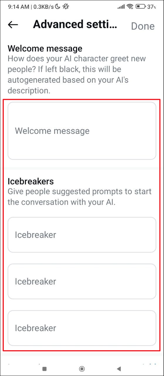 - Here you can add your own Welcome Message, Ice Breakers, Dialogue, and Instructions you want your AI character to use. If you leave these sections blank, Meta's AI Studio will automatically fill them up.