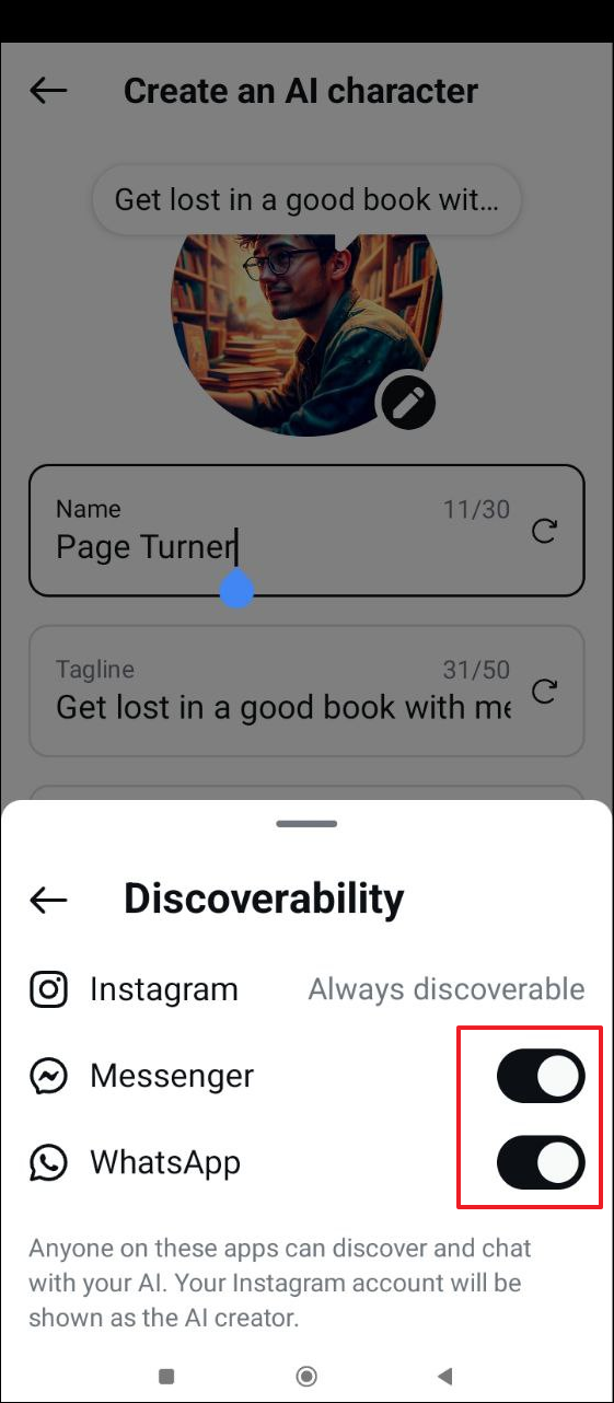 - Your AI character will always be discoverable on Instagram, but you can prevent others from finding it on other Meta platforms like Messenger and WhatsApp by toggling off the respective options.