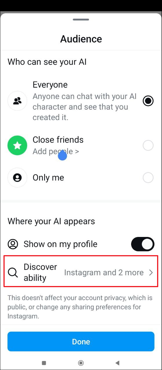 - When you're done, tap on 'Discoverability' to choose whether other people can find your AI character on the platform.