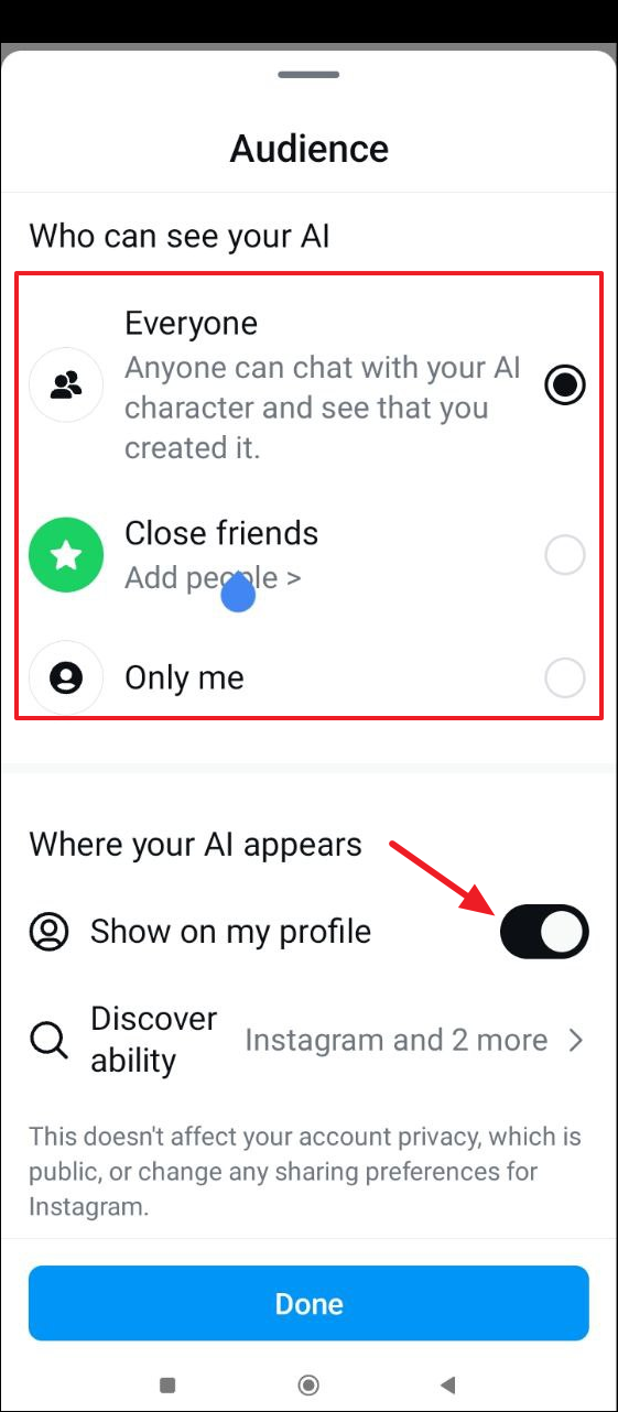 - By default, everyone can interact with your AI character. You can tap on the 'Close friends' or 'Only me' options to change who can see the character. Similarly, you can control whether the AI character appears on your Instagram profile or not by turning the toggle on or off.