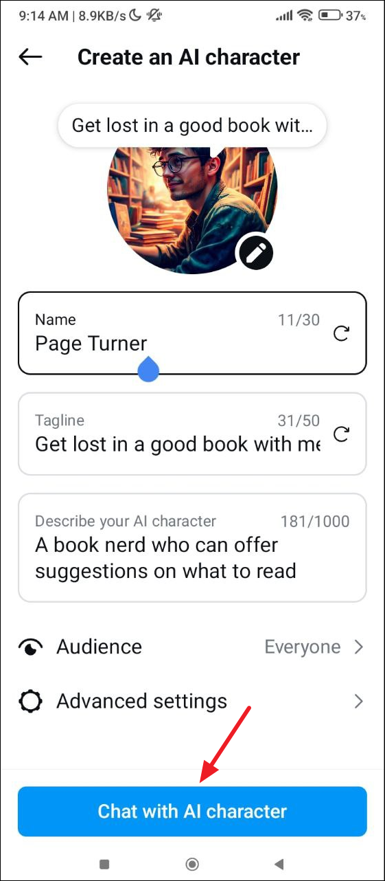 - Now, you're ready to start using your custom AI character. Tap on the 'Chat with AI character' button to get started. Once your character is ready, you will have to wait for up to ten seconds while AI Studio makes it available on the platform.