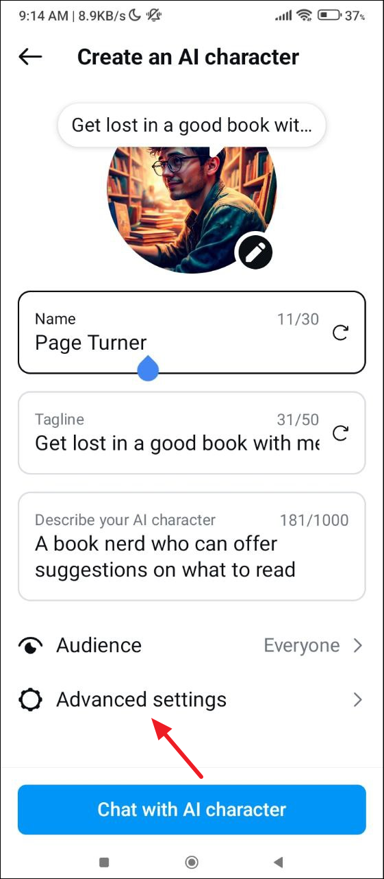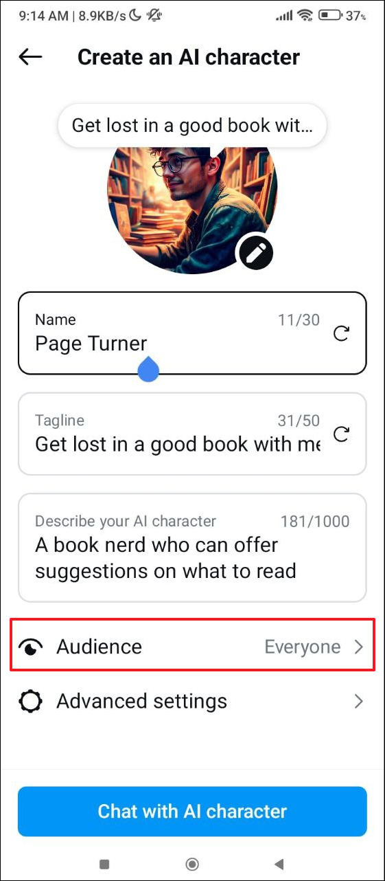 - Next, tap on the 'Audience' option to choose who can see your AI character.