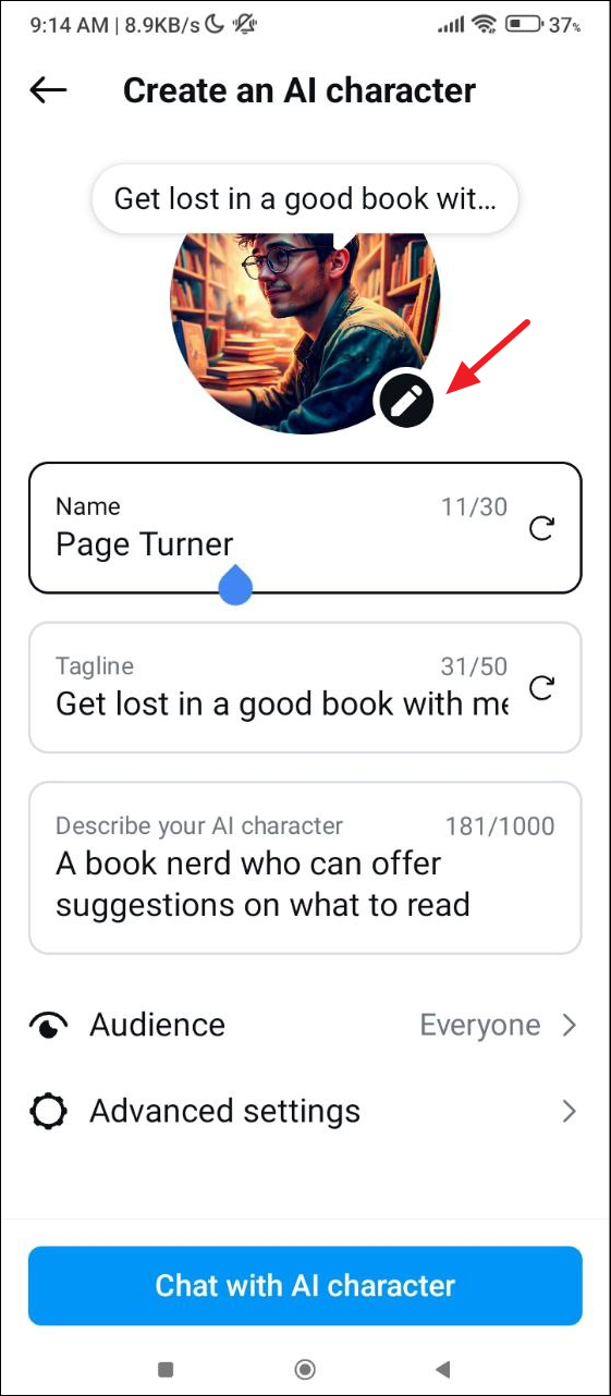- AI Studio will also generate an image for your character. To change the generated image, tap on the pencil icon next to it.