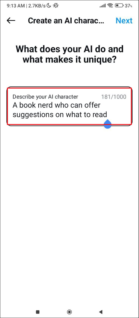 - Next, you can describe your AI character in the text box. Type your description in the box and try to be as detailed as possible for the best results.