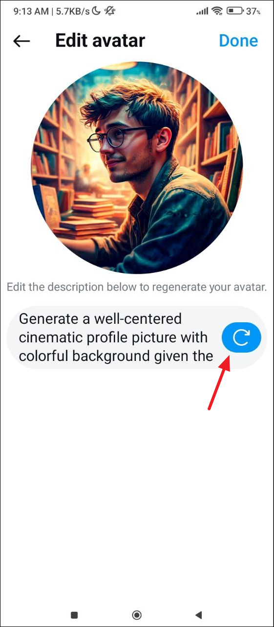 - To change the generated image, you can either enter your own description in the box provided or tap on the blue button to ask the AI to come up with a different description. Tap on 'Done' once you're happy with the generated image.