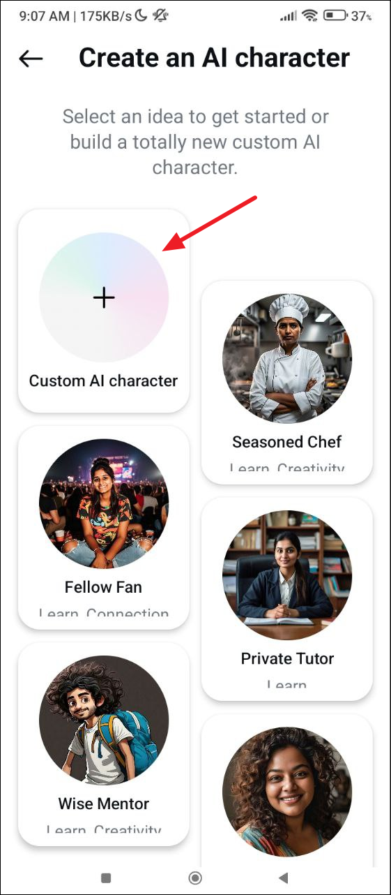 - Now you will see a few AI characters created by others. You can tap on any of them if you want to use that character as the base for your own but to create your own AI character from scratch, tap on 'AI custom character'.