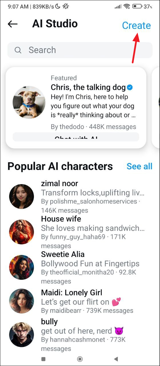 - Here you will see all AI chatbots available. To create your own, tap on the 'Create' option on the top right.