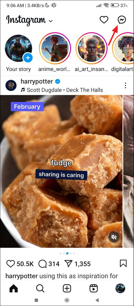 - Open the Instagram app on your smartphone and tap on the 'Messenger' icon on the top right.