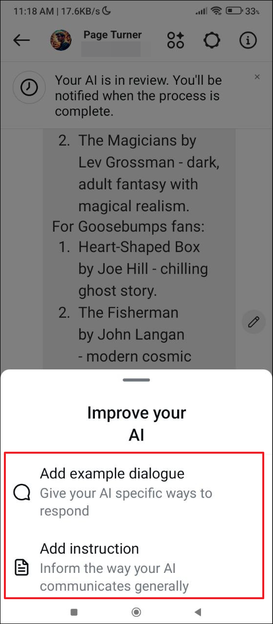 - This will give you two options: you can add an example dialogue or custom instructions for the AI to use.