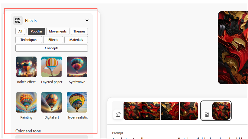- Similarly, you can choose from various styles and apply various effects to the image. You can also adjust the color and tone, camera angle, and lighting of the image from the options on the left.