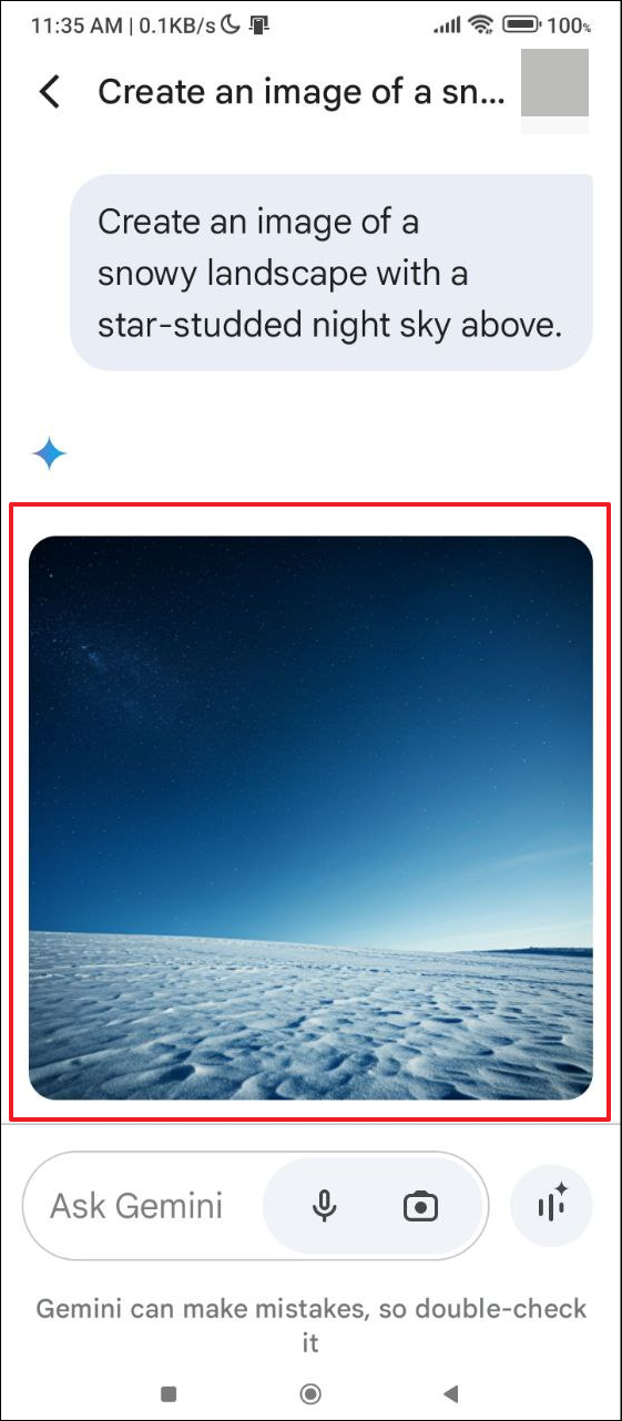 create an image of a snowy landscape with a star-studded night sky above. Then tap the arrow on the right. - Gemini will generate your described image.