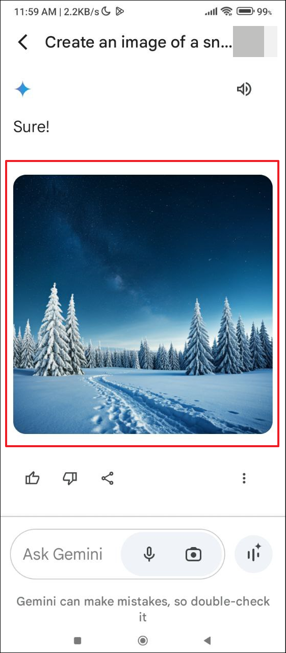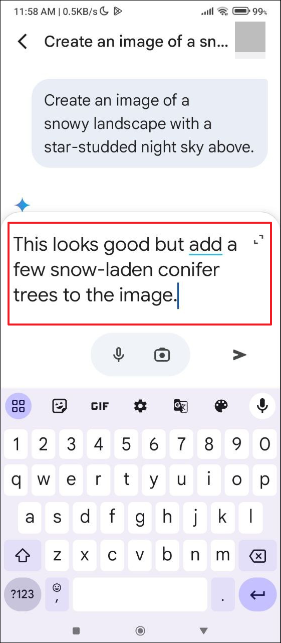 This looks good but add a few snow-laden conifer trees to the imageand tap the arrow again. - Similarly, you can describe other changes you want to see in the image. Just keep in mind that each time you generate an image with Gemini, it will generate a completely new image instead of making changes to the original one.