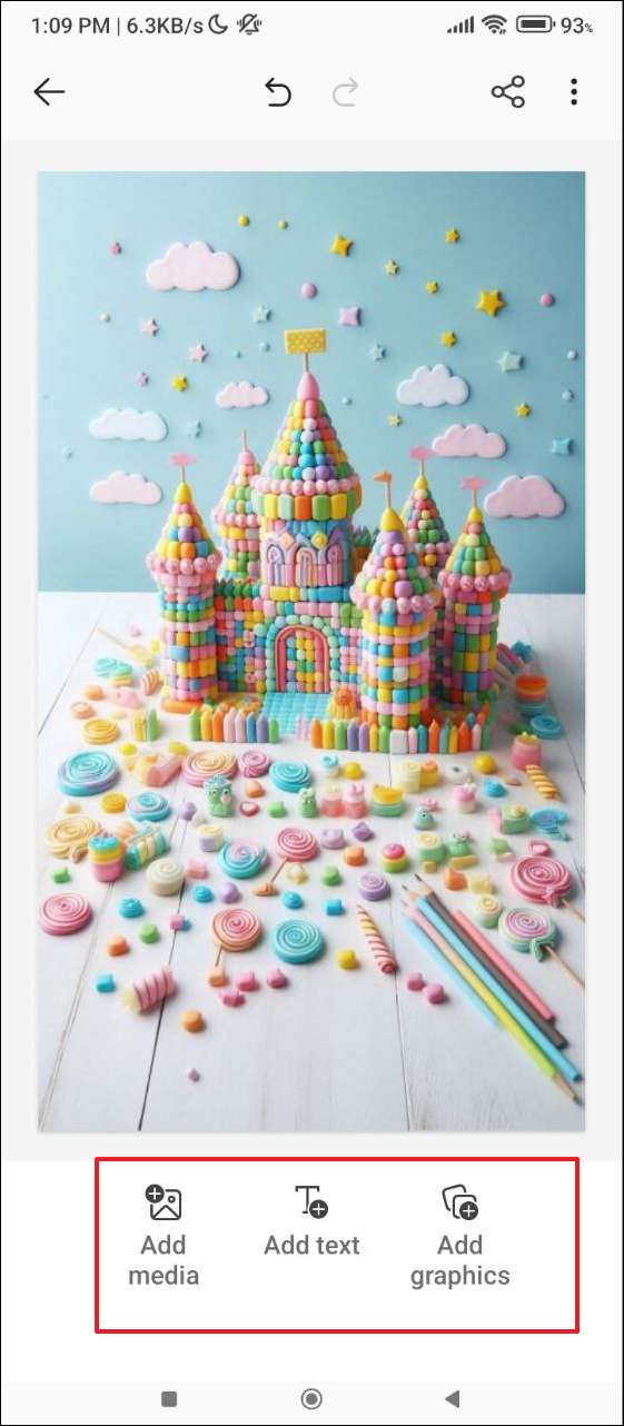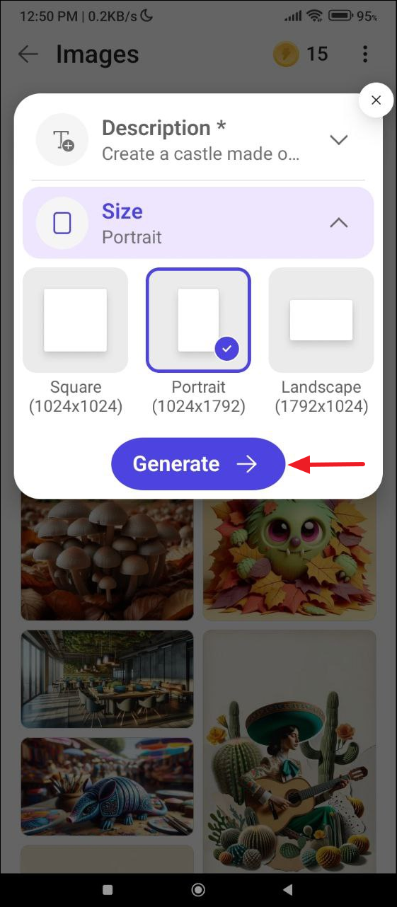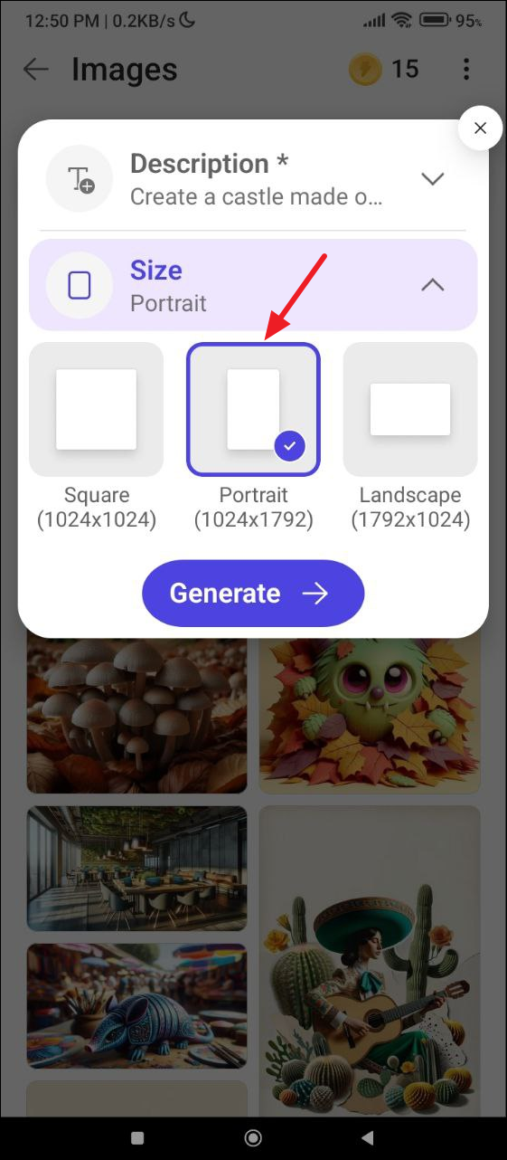 create a castle made of candies in pastel colors. - Then tap on the 'Size' dropdown menu and select the size of the image to be generated. You get three options - the default square option, a portrait option, and a landscape option. For your phone wallpaper, tap on 'Portrait'.