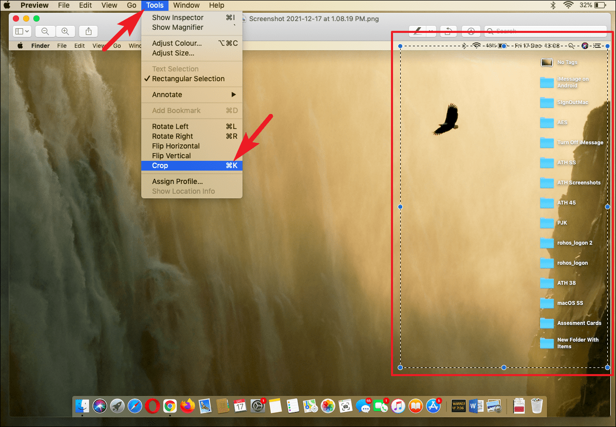 To crop an image, click hold your right mouse button and drag it across the screenshot to select the area you wish to crop out of the whole screenshot. Then, click on the ‘Tools’ option present on the Menu bar. Next, select the ‘Crop’ option from the list. Alternatively, after the selection, you can also press the Command+K keys on your keyboard to crop the image.