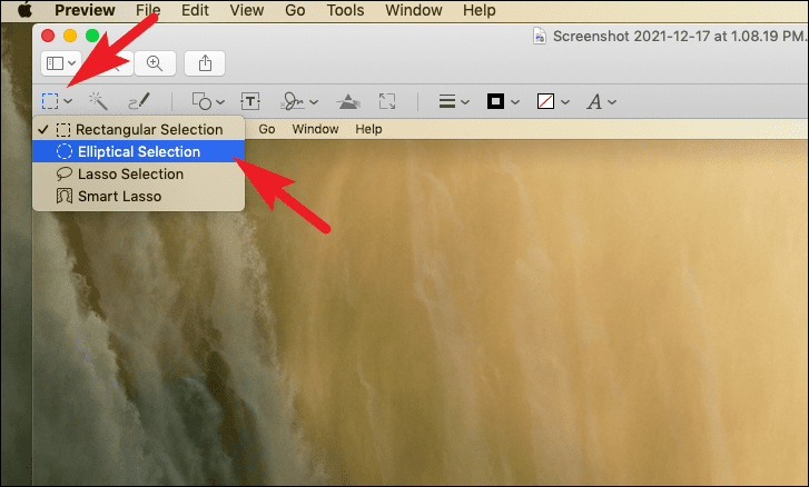 By default, the Preview app only lets you crop in rectangular selection mode. To use elliptical or lasso selection, click on the ‘selection’ tool and select the type of selection as per your need by clicking on one of the options. Then, you can select your desired area and crop the image as shown earlier in this guide.
