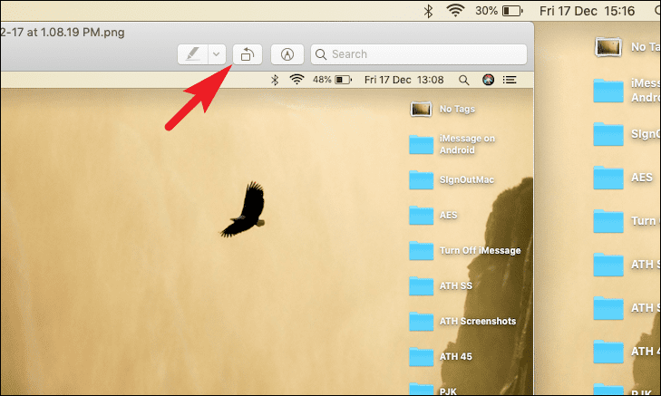 To rotate a picture, click on the ‘Rotate’ icon situated right beside the ‘ Show Markup Toolbar’ toggle icon. This will by default rotate your image to the left by 90 degrees. You can also press the Command+R shortcut key to rotate the image right or the Command+L shortcut key to rotate the image to the left.