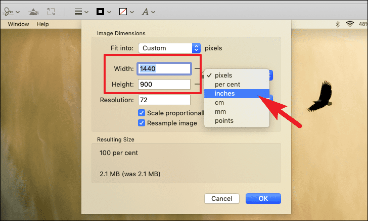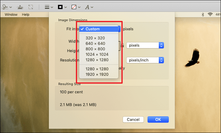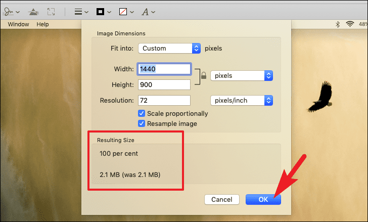 The Preview app will also display the resulting file size according to your current settings. To apply, click on the ‘OK’ button present at the bottom right corner of the pane.