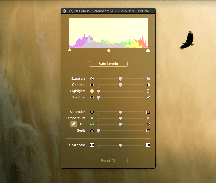 You can also adjust the color spectrum of your screenshot, to do so, click on the ‘Adjust color’ button on the markup toolbar. This will open a separate window pane on your screen.