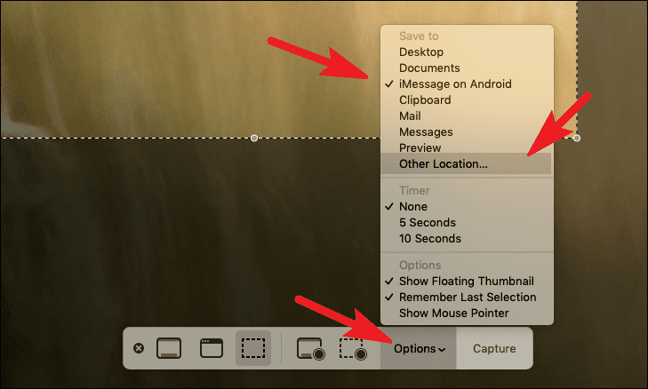 Now, from the bottom bar, click on the ‘Options’ tab. Then, from the overflow menu, choose the folder you wish to save your screenshots in present under the ‘Save To’ section. To manually select a directory, click on the ‘Other location’ option and select a directory using the Finder.