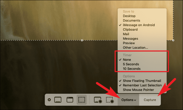 To set a timer for a screenshot, from the ‘Options’ menu, click on your desired option present under the ‘Timer’ section. Then, click on the ‘Capture’ button to click a screenshot after the set duration.