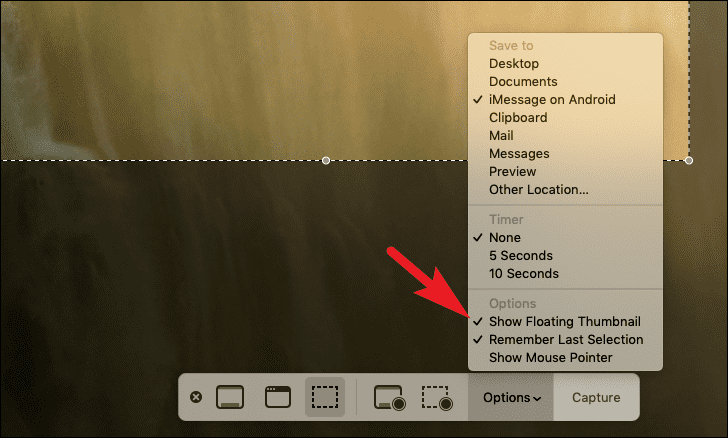 In case you do not wish to see the floating thumbnail of the recently taken screenshot, click to deselect the ‘Show Floating Thumbnail’ option present in the ‘Options’ menu.