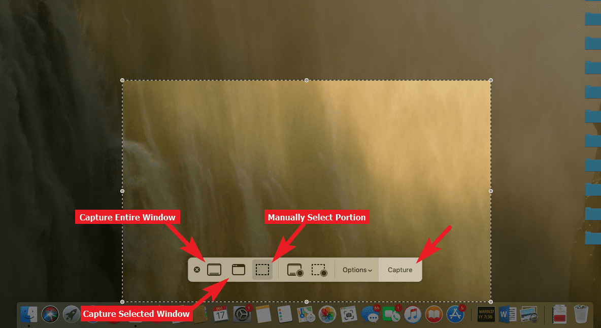 Now, you can choose if you wish to take an entire screen screenshot or a screenshot of a specific window, or manually draw a portion over the screen to capture it by clicking on individual options. Once selected, click on the ‘Capture’ button to click a screenshot.