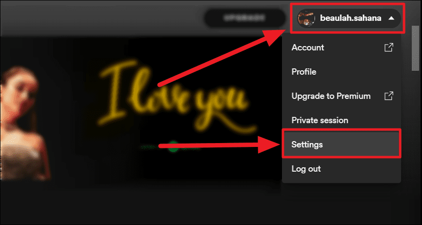- Launch Spotify on your computer and tap your username at the top right corner of the screen. Then, select ‘Settings’ from the drop-down menu.