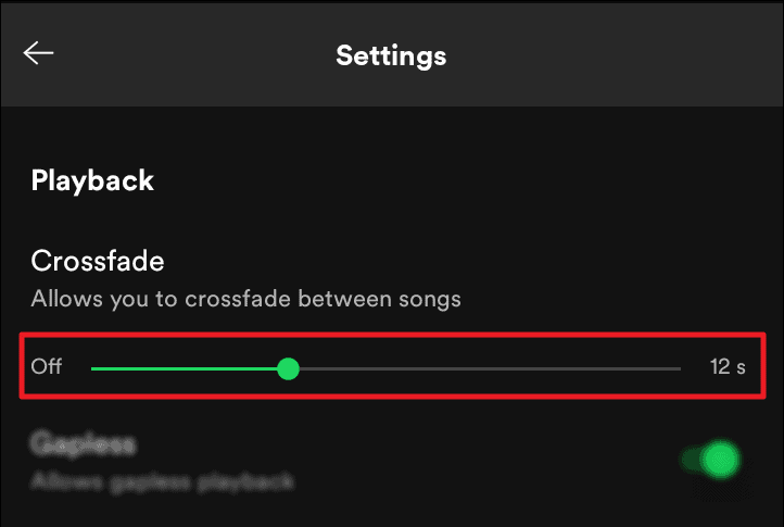 - Scroll a little on the ‘Settings’ page to find the ‘Playback’ section. Here too, the first setting option will be ‘Crossfade’. Tap and move the slider between ‘OFF’ and 12 seconds to set the crossfade duration of your choice.