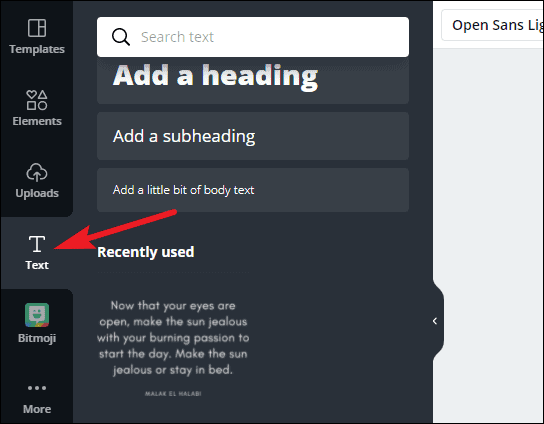 Once you’ve typed the text you want to curve, select it for further editing. You can select every element on a Canva design separately and edit it. To select the text element, just hover over it and click it. Canva will highlight it in blue color.