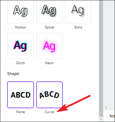 The effects panel will appear on the left. Under the ‘Shape’ section, select ‘Curve’ to curve the text.