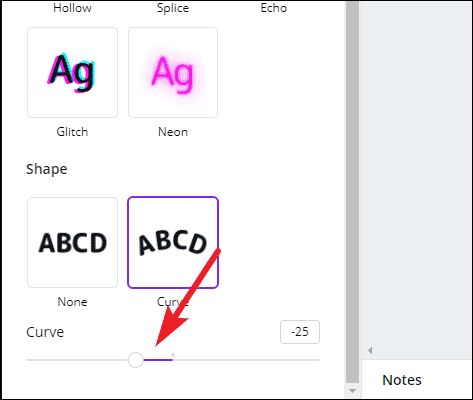 You can select the degree and direction of the curve from the slider beneath the Curve option. Slide right to further curve it in the downward direction, or start sliding it left below zero to curve in the upward direction.