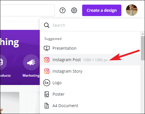 Choose the size for your design. For this guide, we are selecting ‘Instagram Post’. You can also select one of your previous designs to edit them.