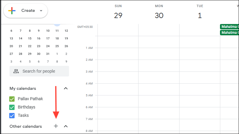 - On the left side, click on the '+' icon next to the 'Other calendars' option to create a new calendar.