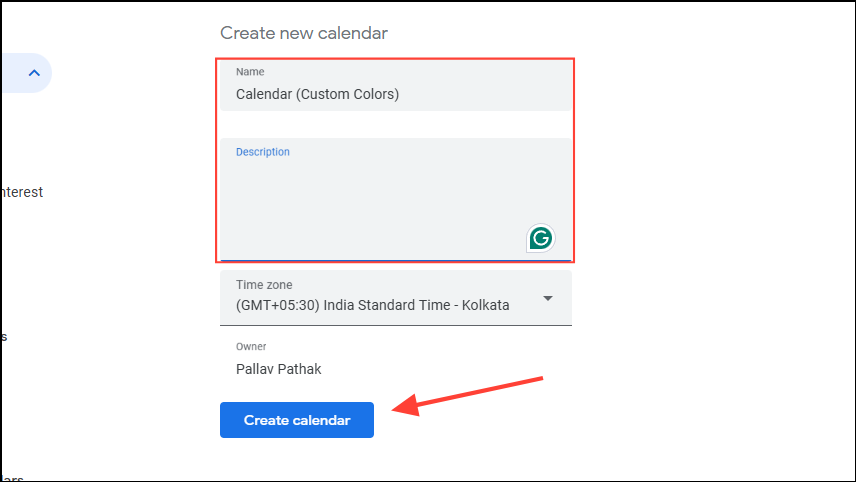 - On the next page, add a name and a description for the new calendar, and then click on the 'Create calendar' button.