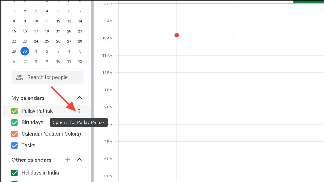 - Now you can set the color of the calendars you have created. Hover your mouse cursor over the name of the calendar whose color you want to set and click on the three dots that appear next to its name.