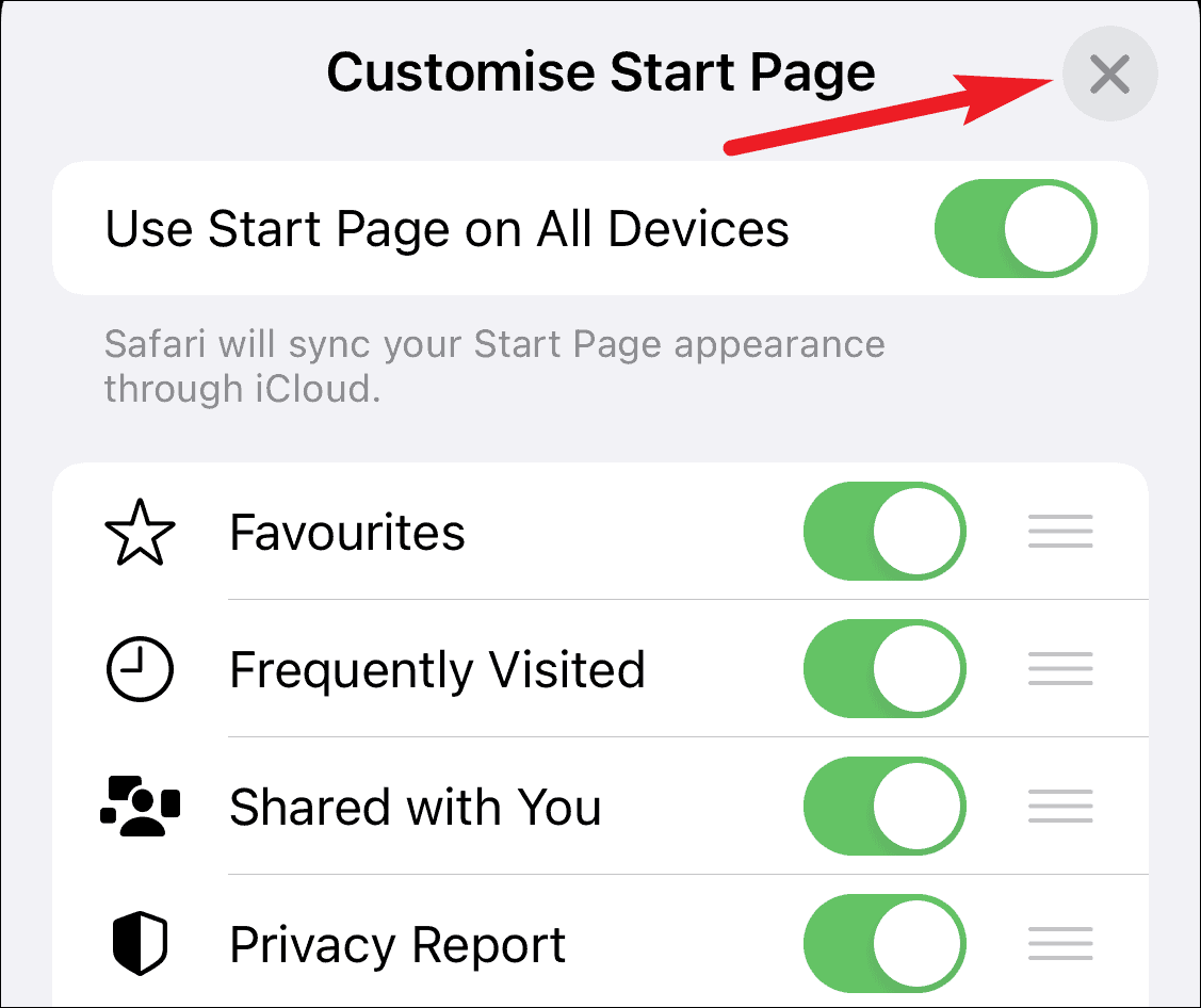 If you want to have the same Start Page across all the Apple devices using your current Apple ID, keep the option for ‘Use Start Page on All Devices’ on, otherwise, disable the toggle.