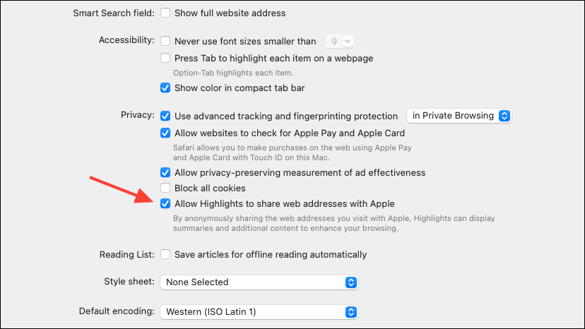 Step 3: In the Settings window, navigate to the Advanced tab. Here, check the box labeled "Allow Highlights to share web addresses with Apple." This enables Safari to use machine learning to analyze pages and display relevant highlights and summaries.