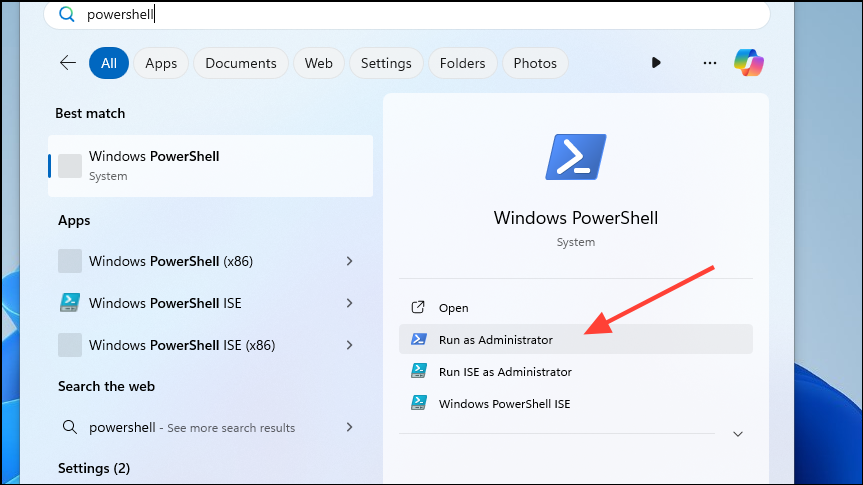 powershell, and click on the 'Run As Administrator' option.