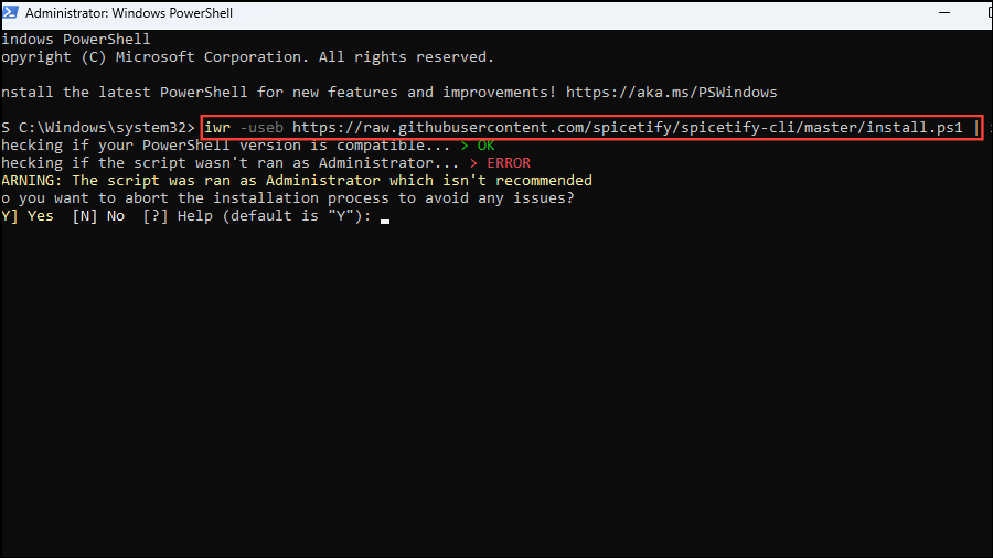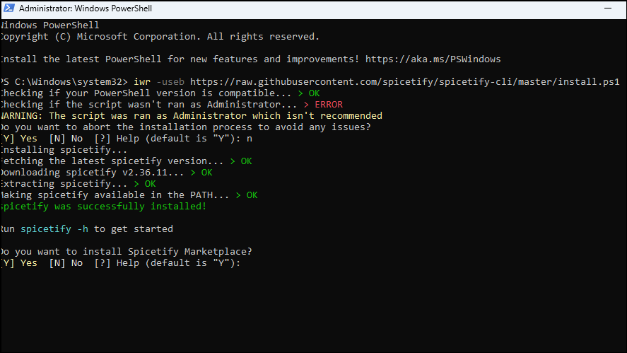 - A warning will appear stating that running the script as an administrator is not recommended. Press 'N' to continue the Spicetify installation.