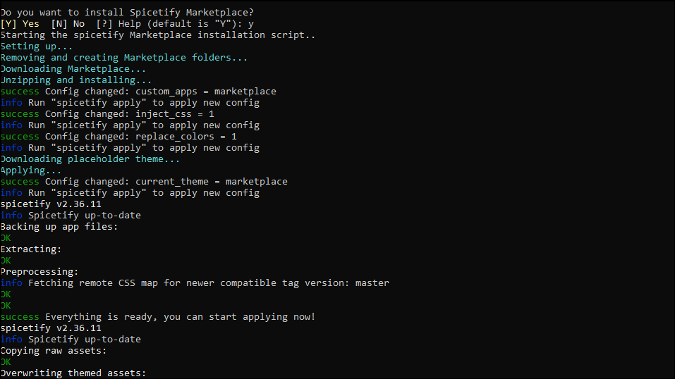 - Now, you will get a prompt asking whether you want to install the Spicetify Marketplace. Press 'Y' to proceed and the Spicetify Marketplace will be installed.