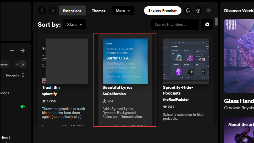 - For instance, the Beautiful Lyrics extension adds synced lyrics with a dynamic background to your music. You can click on it to learn more about it.
