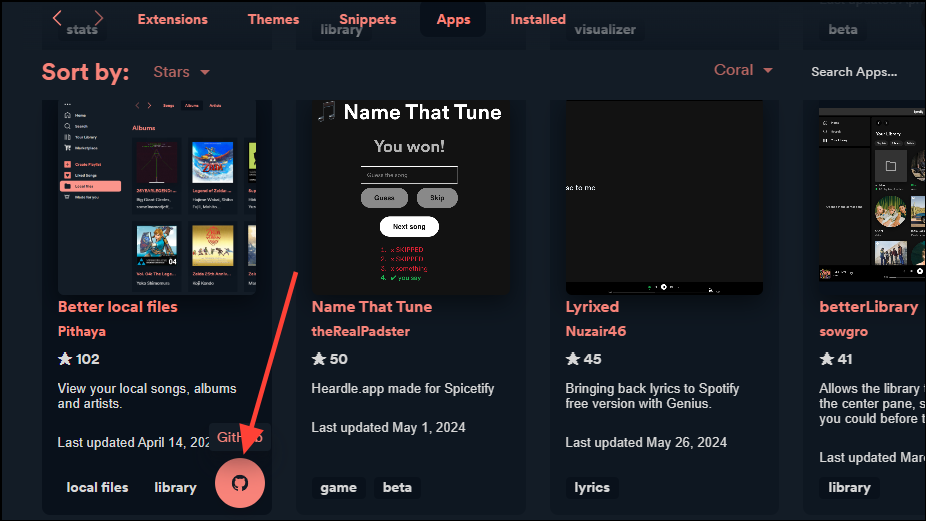 Finally, there are apps, which are similar to extensions in the sense that they also extend Spotify's functionality. However, unlike extensions and themes, you can only install apps through GitHub.