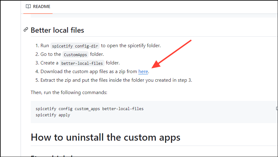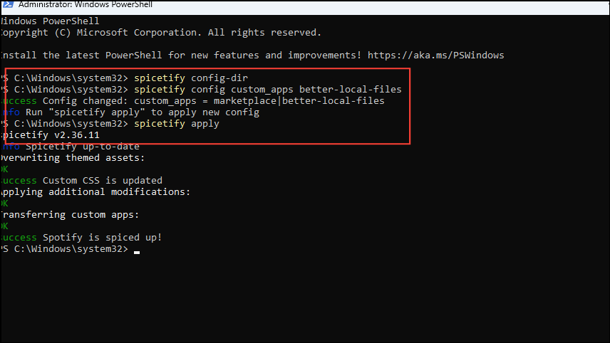 spicetify config custom_apps better-local-filesbefore pressing the 'Enter' key. Follow this with a second command:spicetify applyand press Enter again.