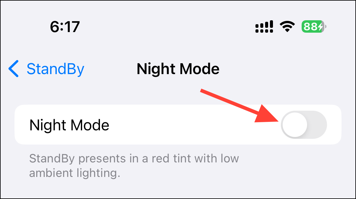 To disable the StandBy screen from turning red, turn off the toggle for 'Night Mode', and you'll have a normal StandBy display even in dark rooms.
