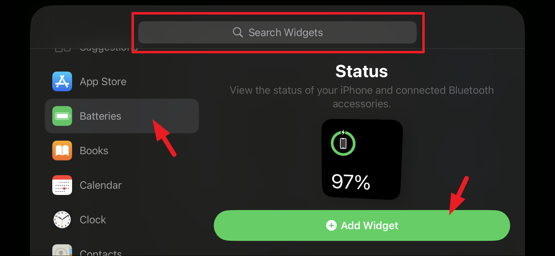 You can also find widgets using the search bar or the app list in the sidebar. Once you've selected a widget, tap on 'Add Widget' to add it to your Smart Stack in StandBy.