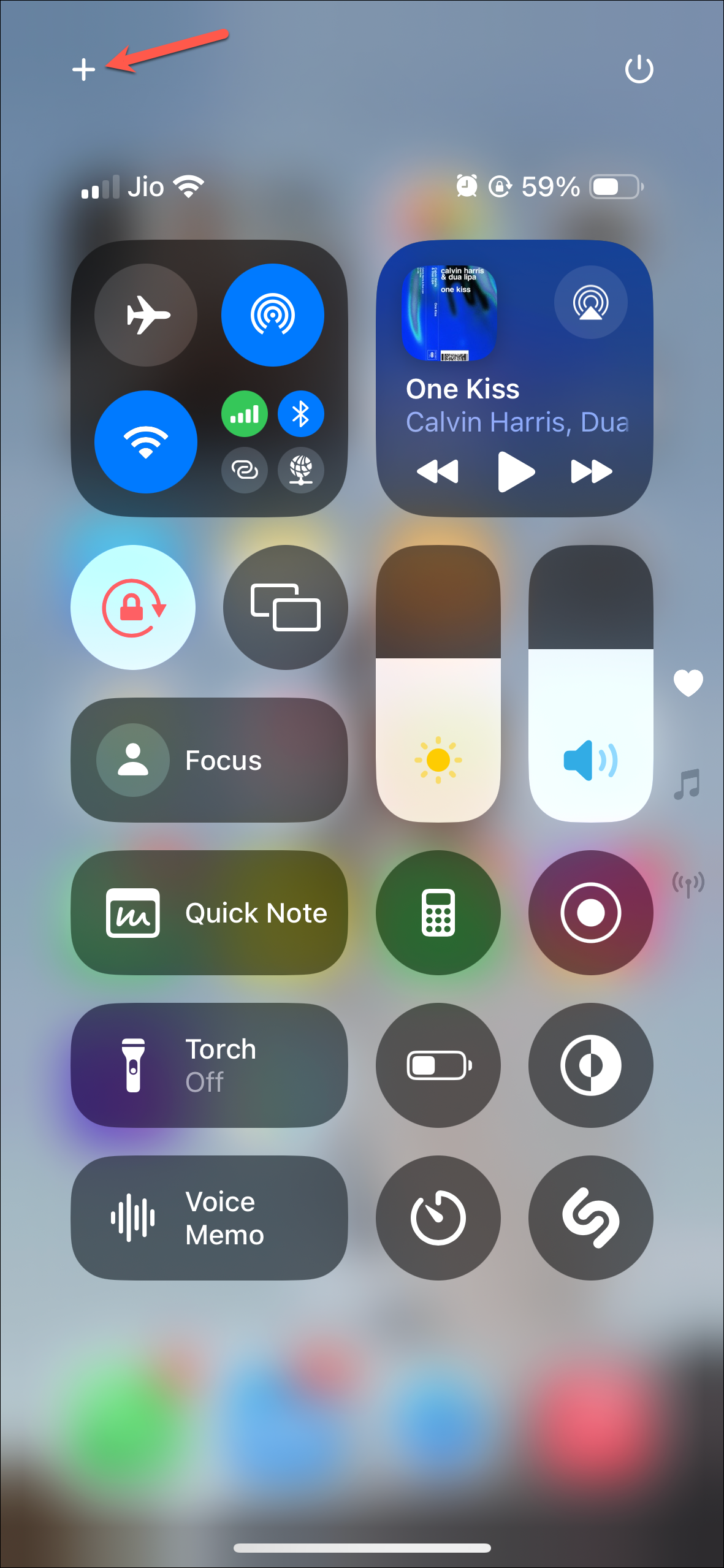 - Then, just like with the Home Screen, tap and hold anywhere on the Control Center. You can also tap the '+' icon in the top-left corner.