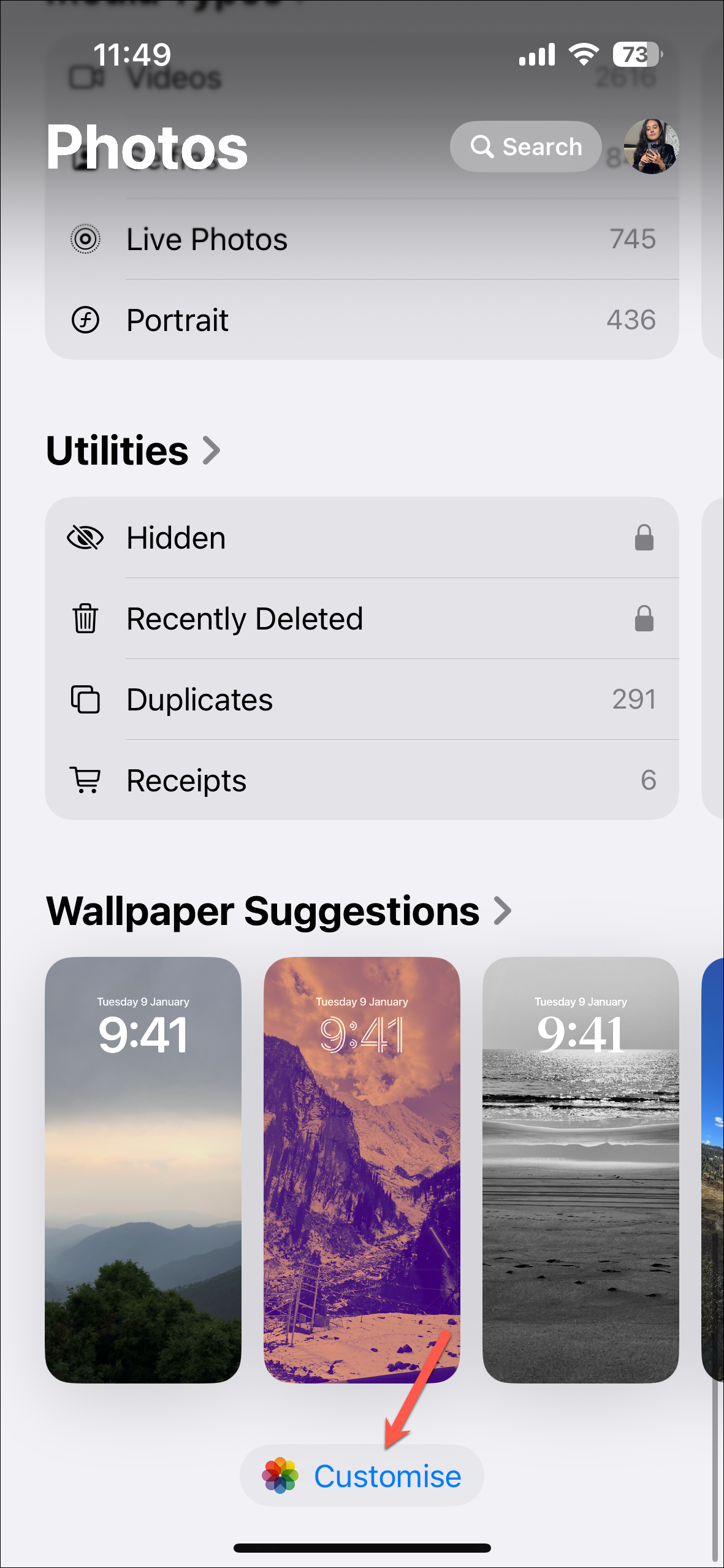 - Then, scroll all the way down and tap on the 'Customise' option.