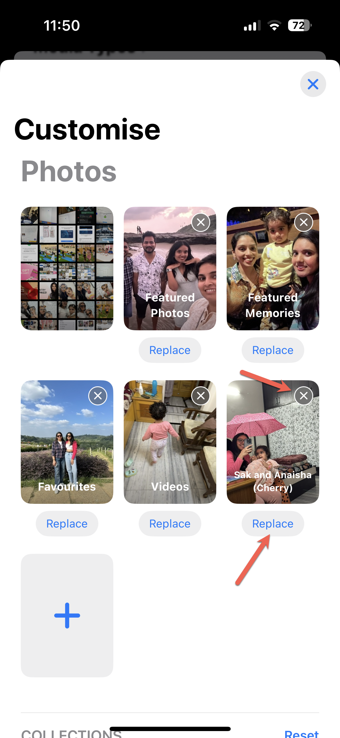 - You can also 'Replace' an existing collection or tap on 'x' to remove it. You can also drag and drop the thumbnails (except the photo grid) to rearrange them.
