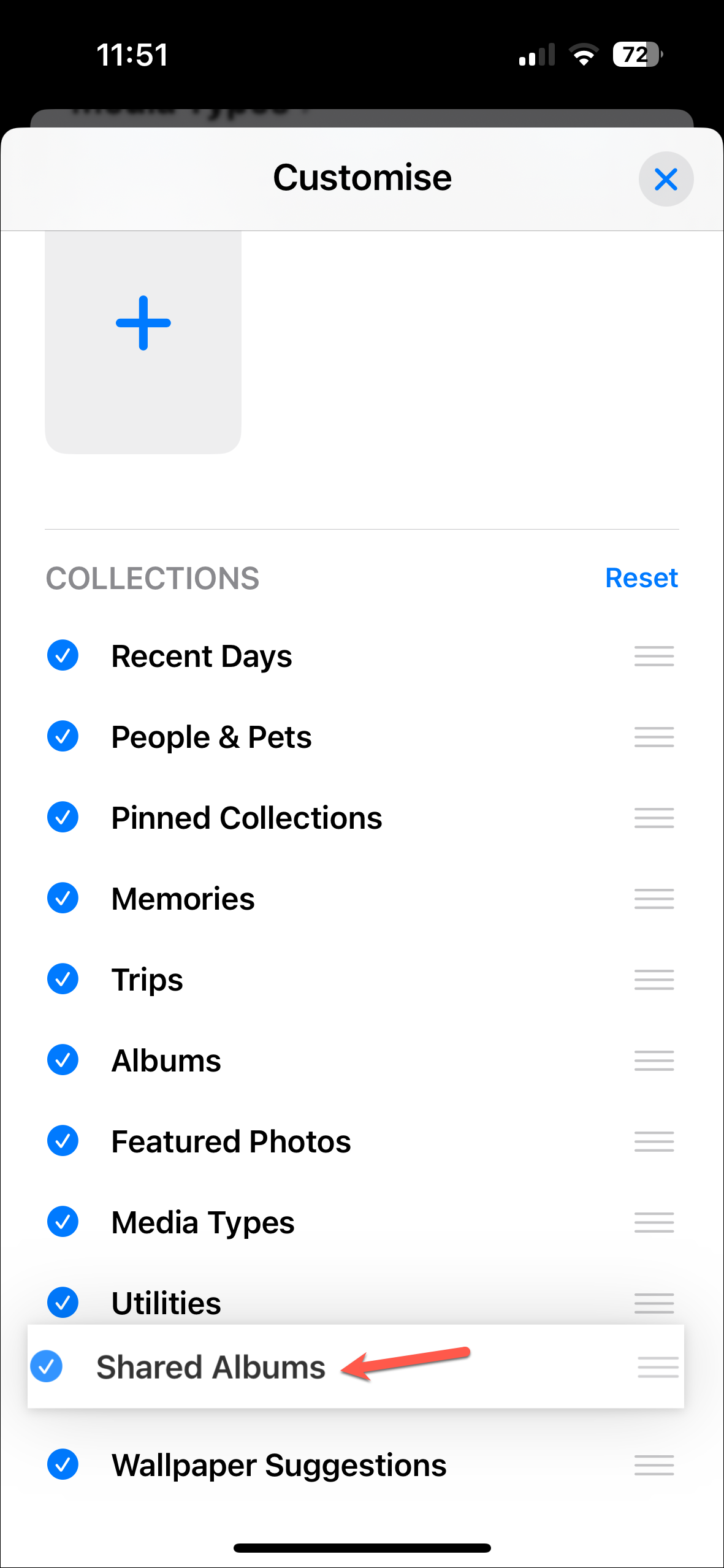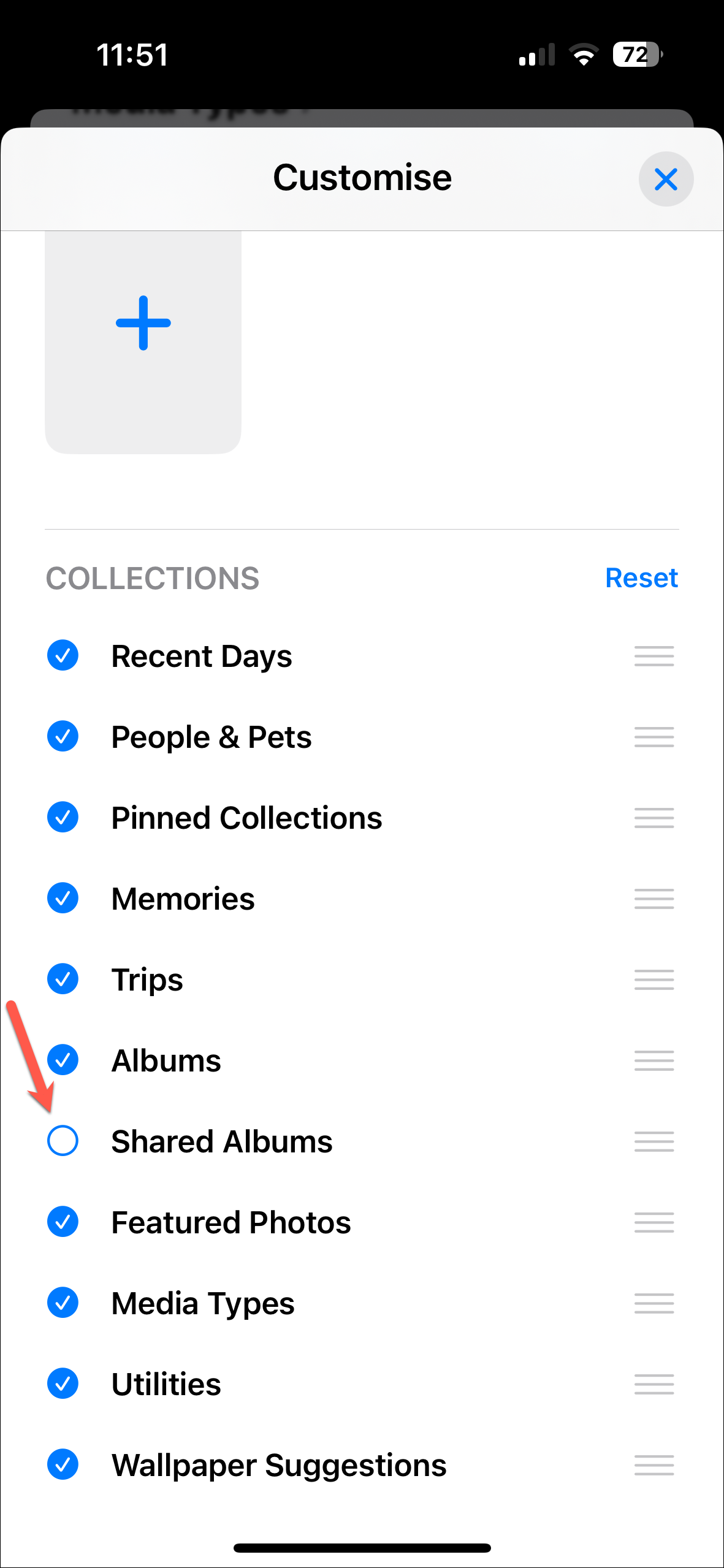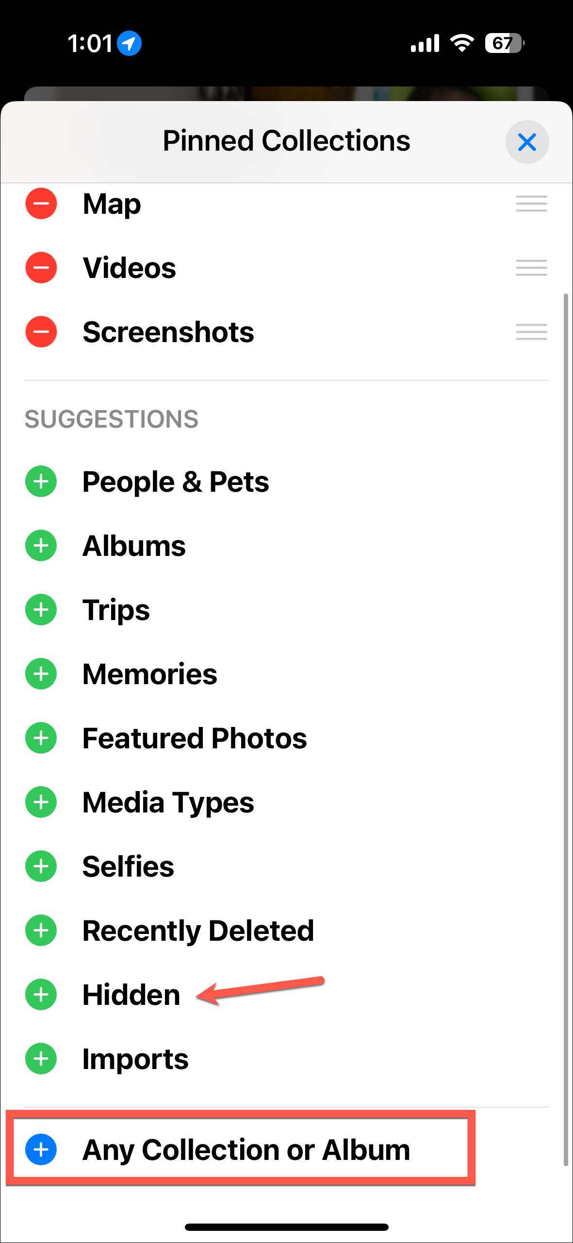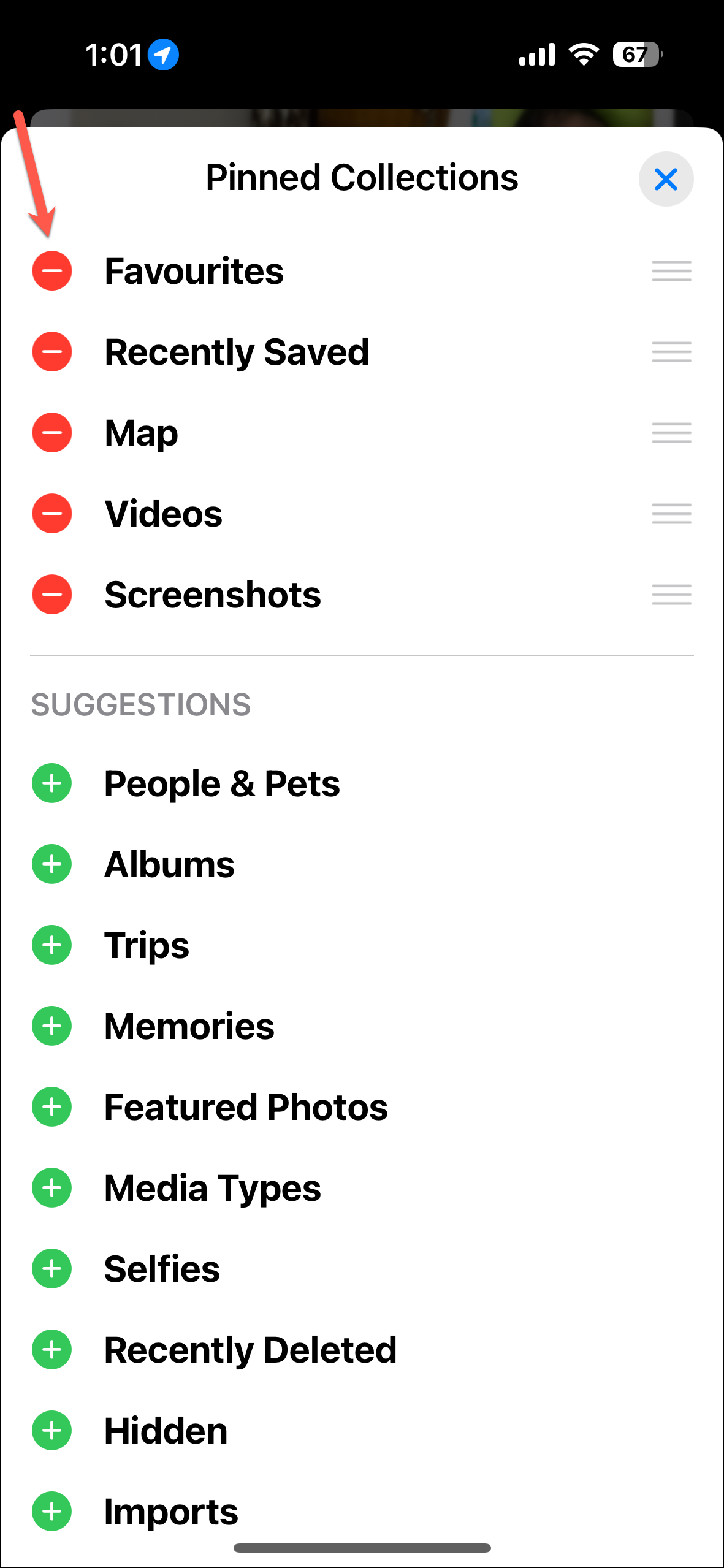 - Then, you can rearrange the existing collections by dragging and dropping them or remove them by tapping the red '-' icon.